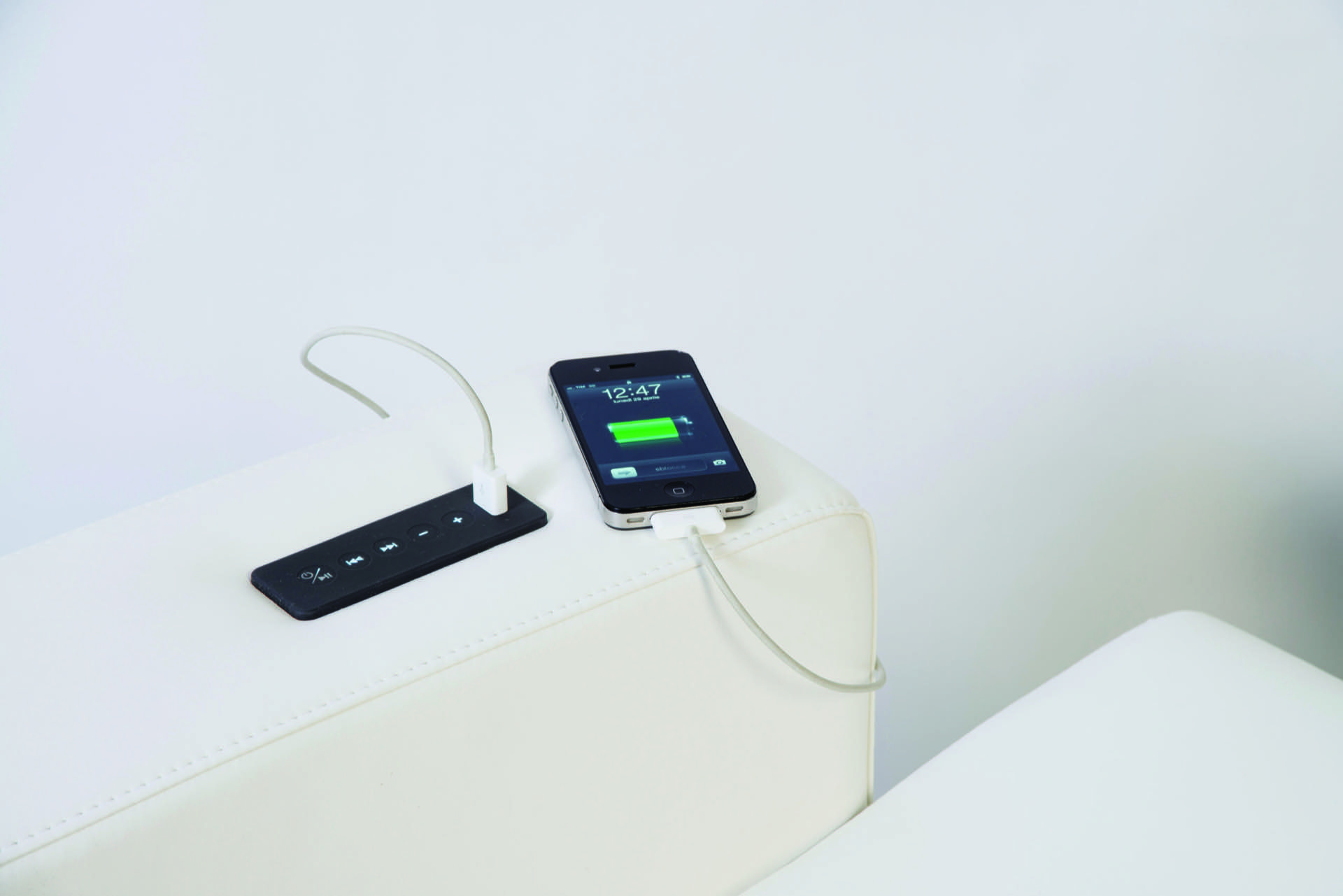 > Rectangular controller with black rubber finish, incorporating a high powered USB for charging smartphones, tablets and notebooks